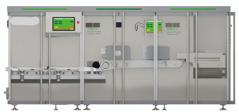 There is visual inspection component at the discharge port, it can detect whether the printing is complete or not. After printed and detected, ampoules will be transferred to plastic tray filling machine, the robot arm will grab the corresponding amount of ampoules into the middle size plastic tray for example 100 pcs.