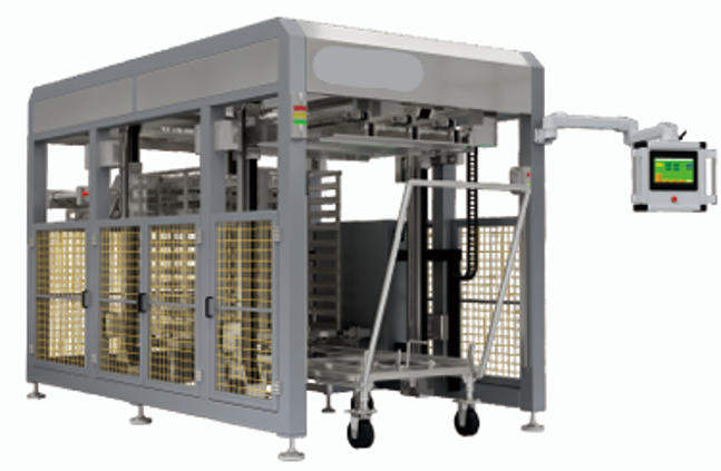 The tray loading machine is used to load the stainless steel trays full of ampoules into the sterilization cart through the robotic arm.